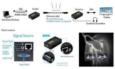 100m VGA Extender - VGA RJ45 Cat5E/6 Üzerinden Sinyal Uzatıcı 100m VGA Extender - VGA RJ45 Cat5E/6 Üzerinden Sinyal Uzatıcı; Masaüstü yada dizüstü bilgisayardan, play station gibi oyun konsollarından, DVD player'lardan başka ekranlara 100 metreye kadar gönderi aktarımına olanak sağlar. 100 metre mesafe içerisinde yer alan televizyon yada projetör ekranlarına görüntü aktarabilmenizi mümkün kılar. Aynı zamanda ses sinyallerini de iletir. İletim için gereken RJ45 kablo ürüne dahil değildir. Desteklediği maksimum çözünürlük 1920x1200'dir. Ürün İçeriği: 1ad. Sender 1ad. Reciever 2ad 5V 2A Adaptör Özellikler: DOS, WIN 3.X, WIN95 / 98 / 98SE / 2K / ME / XP / NT, Apple, MAC Linux, Netware, Unix işletim sistemlerini destekler. Arayüz türü: HDB15-F, RJ45, Ses DC3.5. Destek video formatı: VGA, SVGA, XGA, UXGA. Video çözünürlüğünü destekler: 1920x1200 @ 60Hz. Uzatma mesafesi: 0 ila 100 metre. Güç adaptörü: DC5V @ 1000mA..