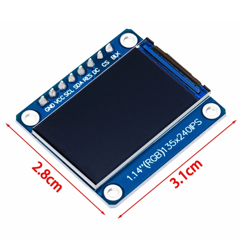Kompakt 1.14 inch TFT LCD ekran modülü, ST7789 sürücü entegresi ile donatılmıştır ve 135x240 piksel çözünürlüğe sahiptir. IPS (In-Plane Switching) teknolojisi sayesinde geniş görüş açısı ve canlı renkler sunar. SPI arabirimi ile çalışan bu modül, Arduino, ESP32, STM32 ve Raspberry Pi gibi geliştirme kartları ile kolayca entegre edilebilir.