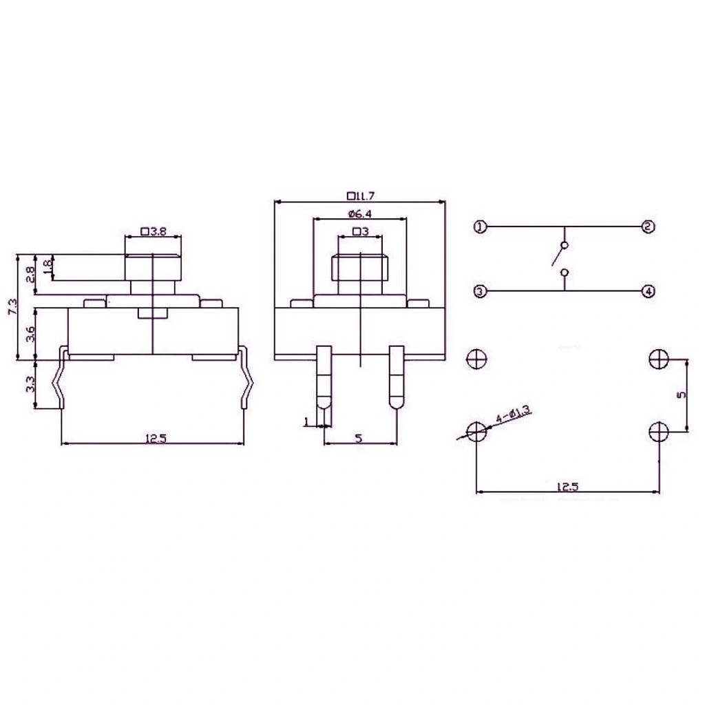 12x12x7.3mm Tact Switch, 4 pinli yapısı ile aslında elektriksel olarak 2 pinli bir anahtardır. İç yapısında çapraz köşelerdeki pinler birbirine bağlıdır, böylelikle daha sağlam bir PCB montajı sağlanır.