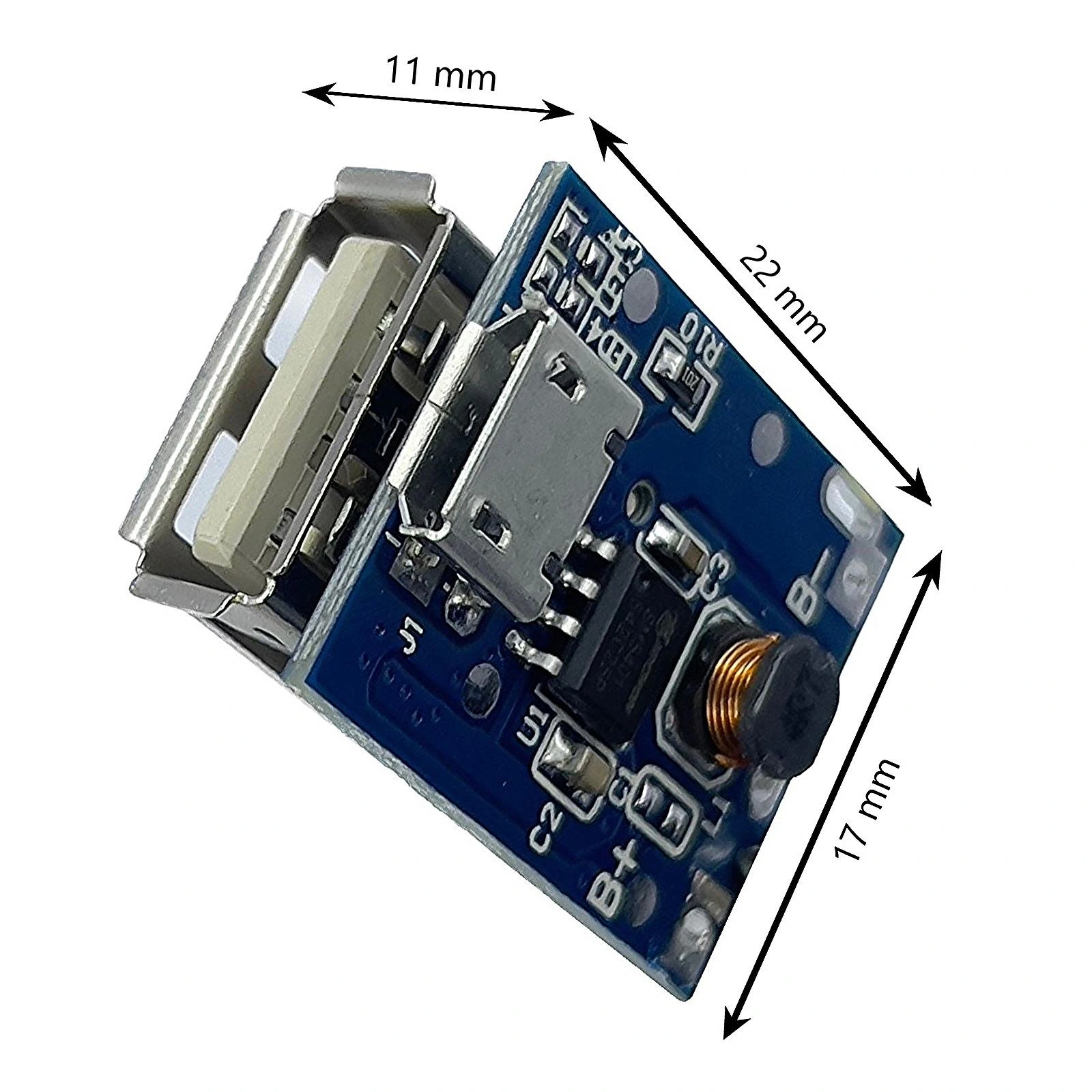 Kırmızı LED şarj işlemini, mavi LED ise modülün çalışır durumda olduğunu gösterir.