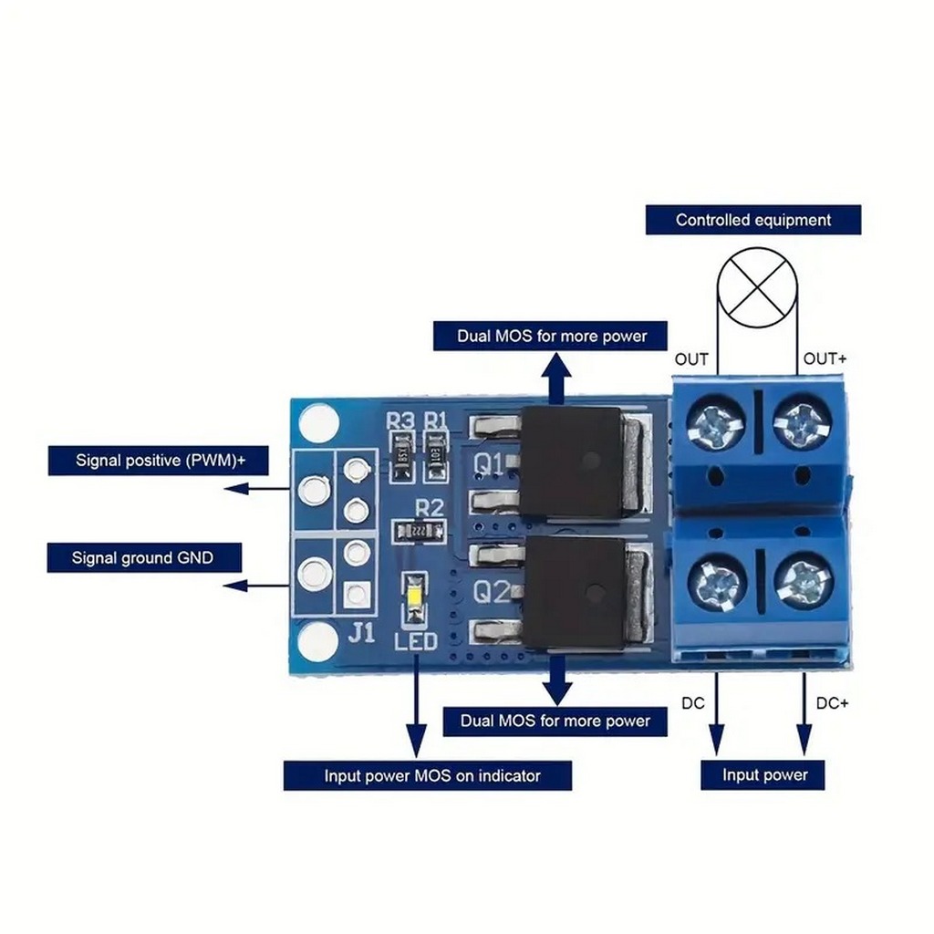15A 400W PWM Kontrollü MOSFET Anahtarlama Modülü, elektronik projelerde ve güç kontrol uygulamalarında kullanılan bir anahtarlama modülüdür. Bu modül, Pulse Width Modulation (PWM) tekniği ile çalışan bir MOSFET anahtarı içerir. PWM, çıkış gücünü düzenlemek için kullanılan bir tekniktir ve bu modül, 15A'ya kadar akım kapasitesine ve 400W'a kadar güç yönetimine olanak tanır. Bu sayede motorlar, LED aydınlatmalar, ısıtıcılar ve diğer yüksek güçlü cihazlar için ideal bir kontrol çözümü sağlar.