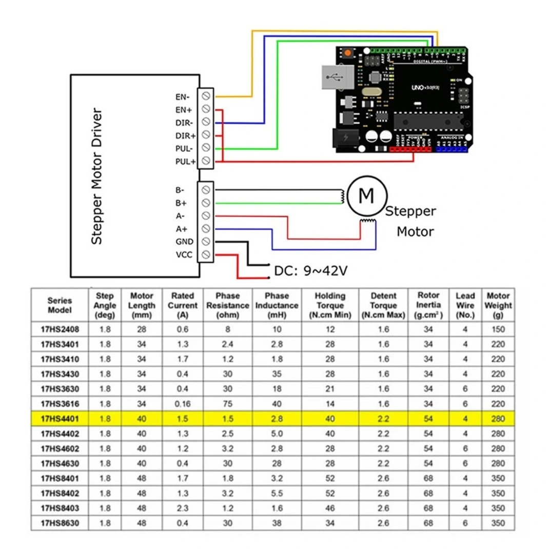 17HS4401 NEMA 17 Step Motor, çift taraflı 5mm çaplı milleri ve kaliteli rulman yapısı ile uzun ömürlü ve güvenilir performans sunarken, Arduino platformları ve çeşitli motor sürücü kartları ile kolayca entegre edilebilir.