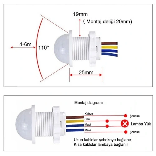 - Bağlantı Kablosu: 25cm (3 telli: Faz, Nötr, Çıkış)