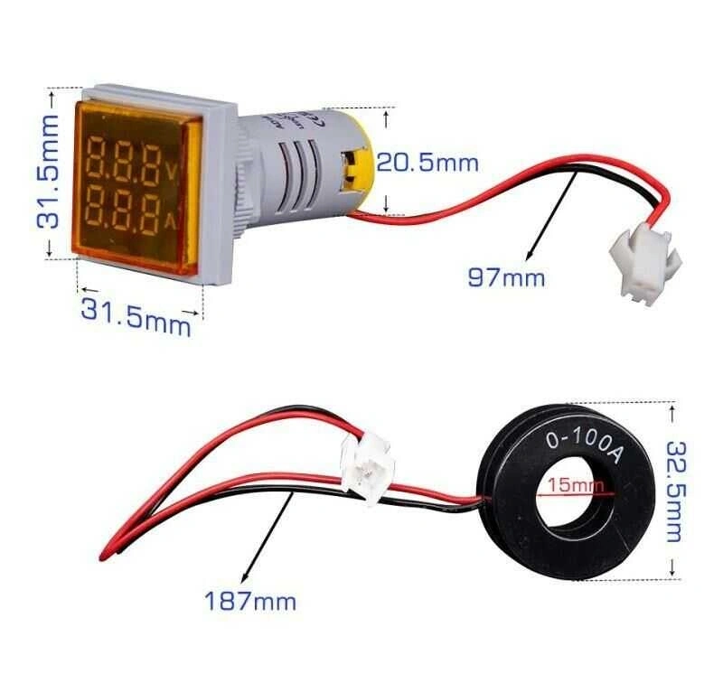 22mm Dijital Voltmetre-Ampermetre AC 20-500V 0-100A Sarı
