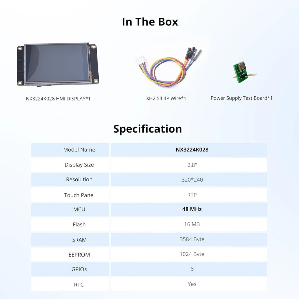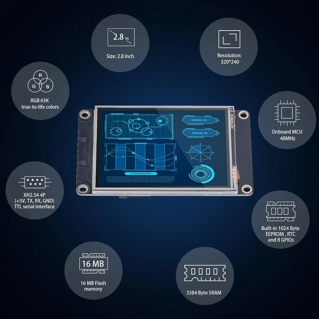 2.8 Inch Nextion Ekran 16MB Dahili Hafıza NX3224K028, mikrodenetleyici projeleriniz için kompakt boyutta güçlü bir dokunmatik HMI (İnsan-Makine Arayüzü) çözümüdür. Bu küçük ama yetenekli ekran, 320x240 piksel çözünürlüğü ve 16MB dahili hafızasıyla, sınırlı alanlarda bile zengin ve etkileşimli kullanıcı arayüzleri oluşturmanıza olanak tanır.