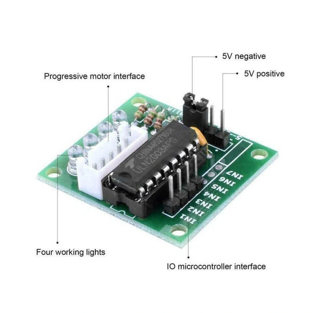 Set içinde gelen ULN2003A sürücü kartı, dört kanal darlington transistör dizisi içerir ve motor bobinlerini doğrudan mikrodenetleyiciden kontrol etmenizi sağlar. Kart üzerindeki LED'ler, motor fazlarının aktifleştiğini görsel olarak gösterir.
