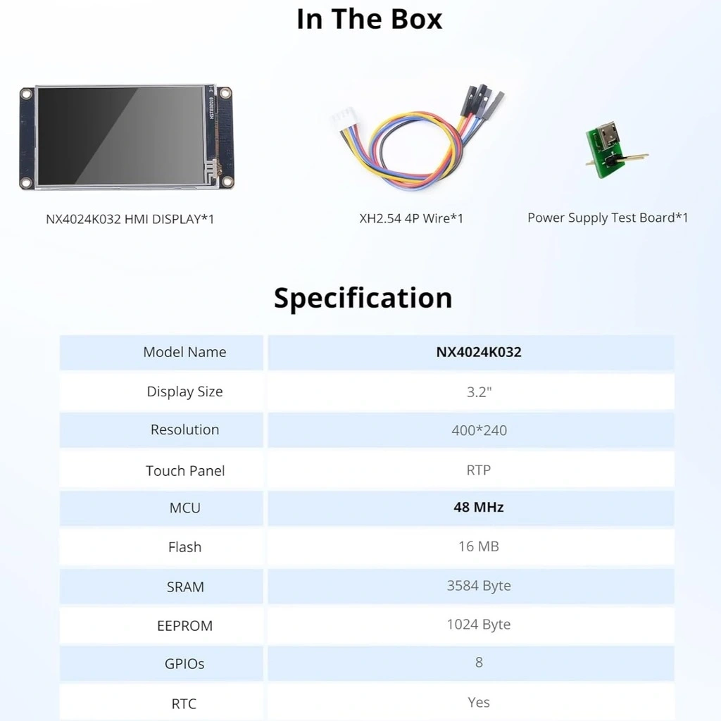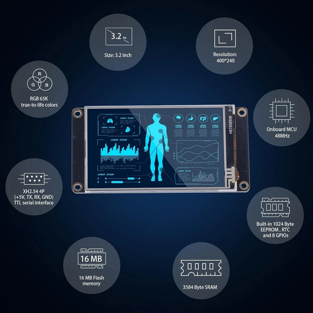 3.2 inch Nextion akıllı ekran (NX4024K032), elektronik projelerinize profesyonel görünümlü, dokunmatik arayüzler eklemenizi sağlayan gelişmiş bir HMI (İnsan-Makine Arayüzü) çözümüdür. 400x240 piksel çözünürlüğe sahip renkli TFT ekran, kapasitif dokunmatik panel ve 16MB dahili hafızasıyla kullanıcı arayüzlerinizi son derece zengin görseller ve interaktif öğelerle tasarlamanıza olanak tanır.