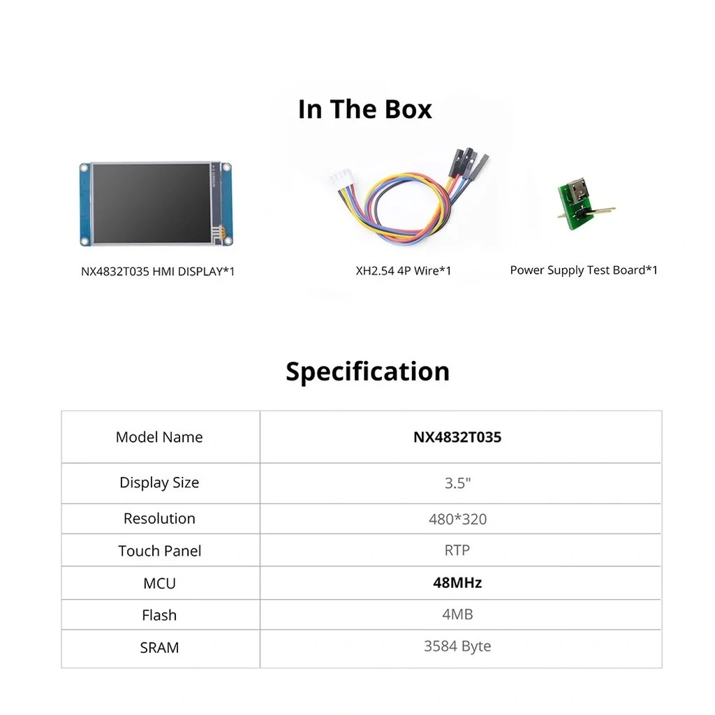 3.5 inç Nextion (480x320) 3.2 inç modele (400x240) göre %20 daha büyük ve %50 daha fazla piksel sunar. Daha büyük ekran daha fazla içerik göstermenize ve daha büyük dokunmatik alanlar kullanmanıza olanak tanır. Arayüz tasarımı farklı olacağından, HMI dosyaları bu iki model arasında doğrudan uyumlu değildir.