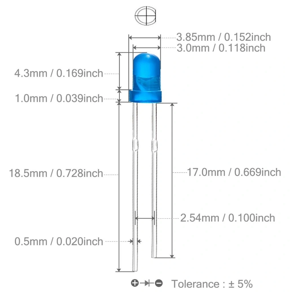 "3mm" ifadesi, diyodun çapının 5 milimetre olduğunu belirtir. "Led Mavi Diyot" ifadesi, diyodun mavi renkte olduğunu ve bir LED (ışık yayan diyot) olduğunu gösterir."Diffused" ifadesi, diyotun yaydığı ışığın daha homojen bir şekilde yayıldığını ifade eder.Diffused diyotlar, yoğun bir nokta ışığı yerine daha dağılmış bir ışık yayarak daha geniş bir aydınlatma sağlar.