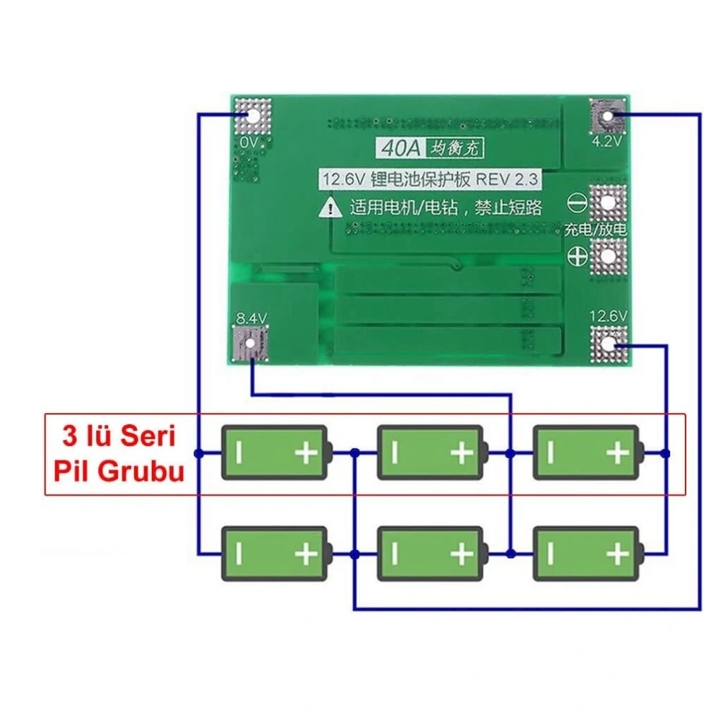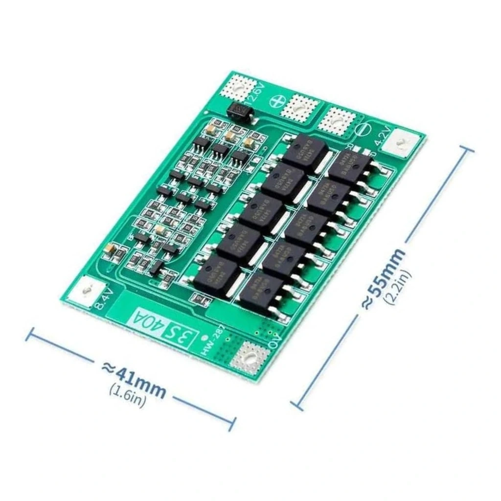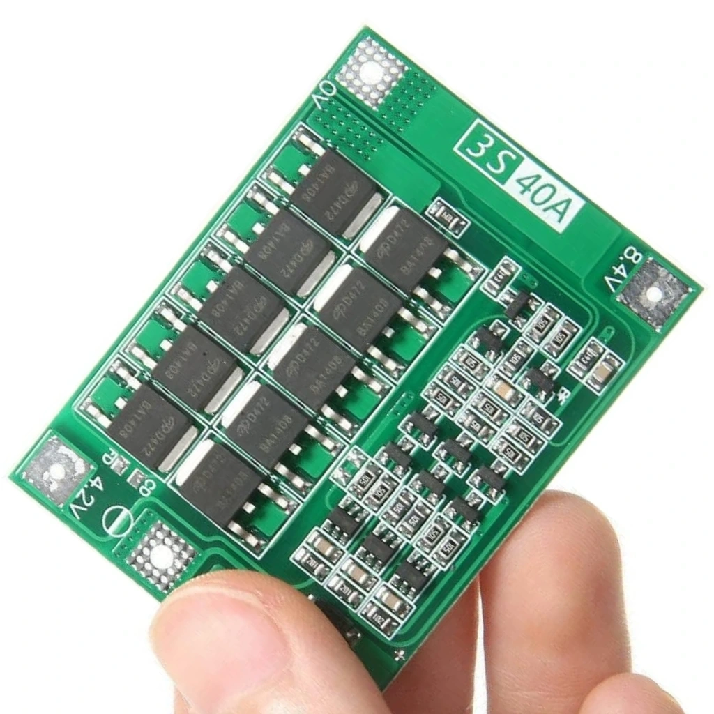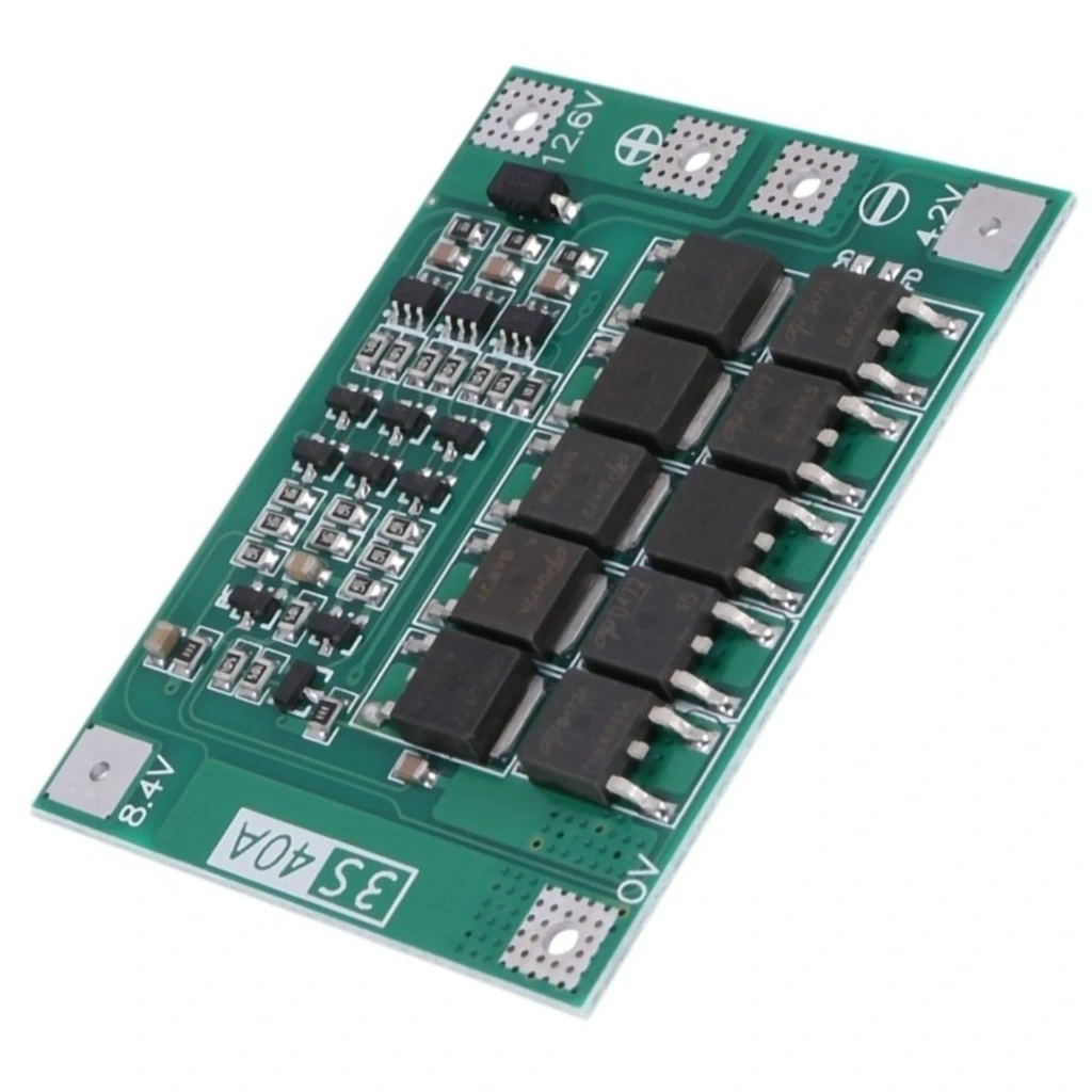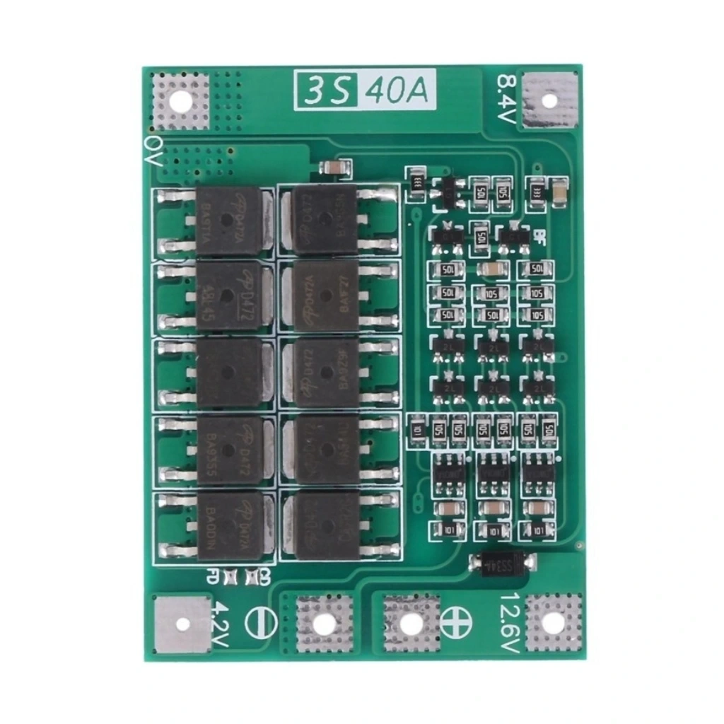 3S 40A 12.6V lityum batarya BMS (Battery Management System) modülü, üç seri bağlı (3S) lityum pil paketleri için tasarlanmış bir koruma devresidir. Bu balanssız BMS, pil hücrelerini aşırı şarj, aşırı deşarj, aşırı akım ve kısa devreye karşı korur. Özellikle yüksek akım gerektiren uygulamalarda pil paketlerinin güvenli ve stabil çalışmasını sağlar. Balanssız yapısı sayesinde temel koruma sağlar, ancak hücreler arası gerilim dengelemesi yapmaz.
