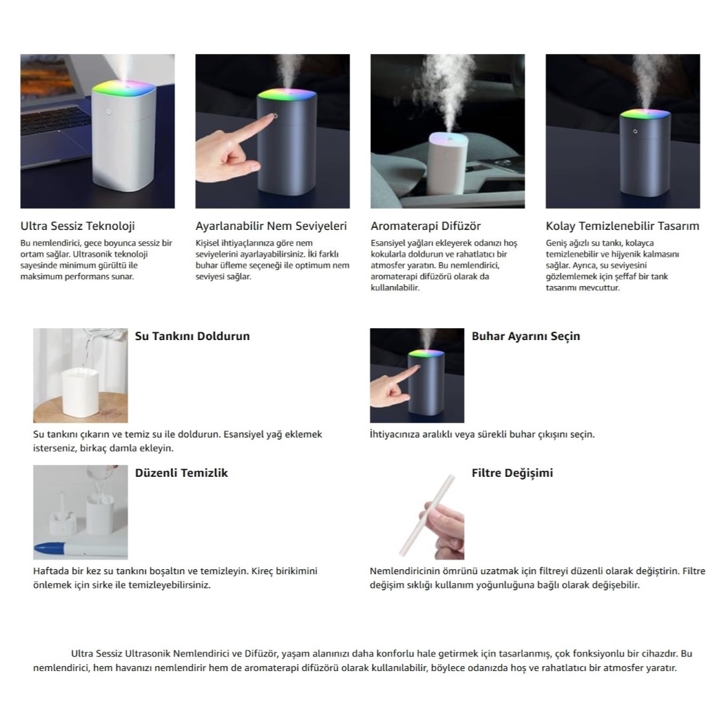 - Taşınabilirlik : USB ile çalışan bu nemlendirme, evde, ofiste, araçta veya seyahatlerde taşınabilir ve kullanılabilir.