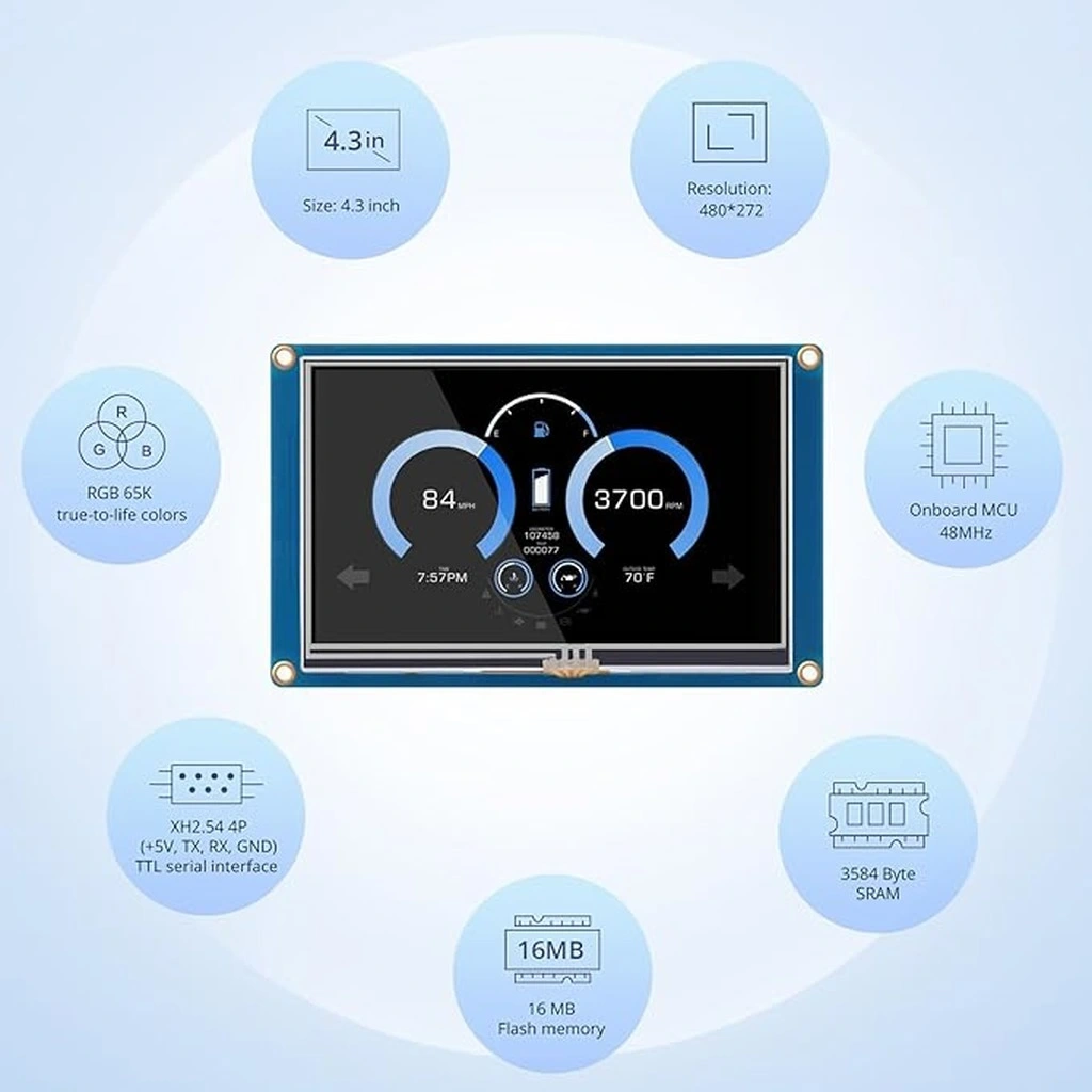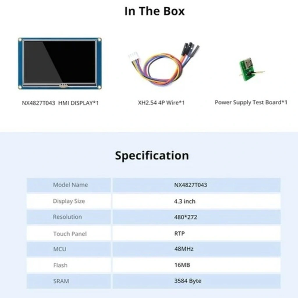 4.3 inch Nextion akıllı ekran (NX4827T043), elektronik projelerinize profesyonel dokunmatik arayüz eklemenizi sağlayan gelişmiş bir HMI (İnsan-Makine Arayüzü) çözümüdür. 480x272 piksel çözünürlüğe sahip geniş renkli TFT ekran, rezistif dokunmatik panel ve 16MB dahili hafızasıyla, kompleks ve görsel açıdan zengin kullanıcı arayüzleri oluşturmanıza olanak tanır.