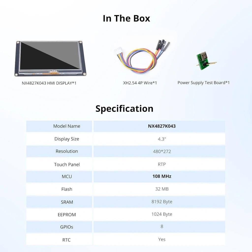 4.3 Inch Nextion Ekran, gelişmiş özellikleri ve büyük dahili hafızasıyla elektronik projelerinize profesyonel bir kullanıcı arayüzü kazandırmak için tasarlanmış HMI (İnsan-Makine Arayüzü) çözümüdür. 32MB flash belleğe sahip bu K serisi ekran modülü, 480x272 piksel çözünürlük ve 65K renk desteği ile projelerinize görsel zenginlik katar.