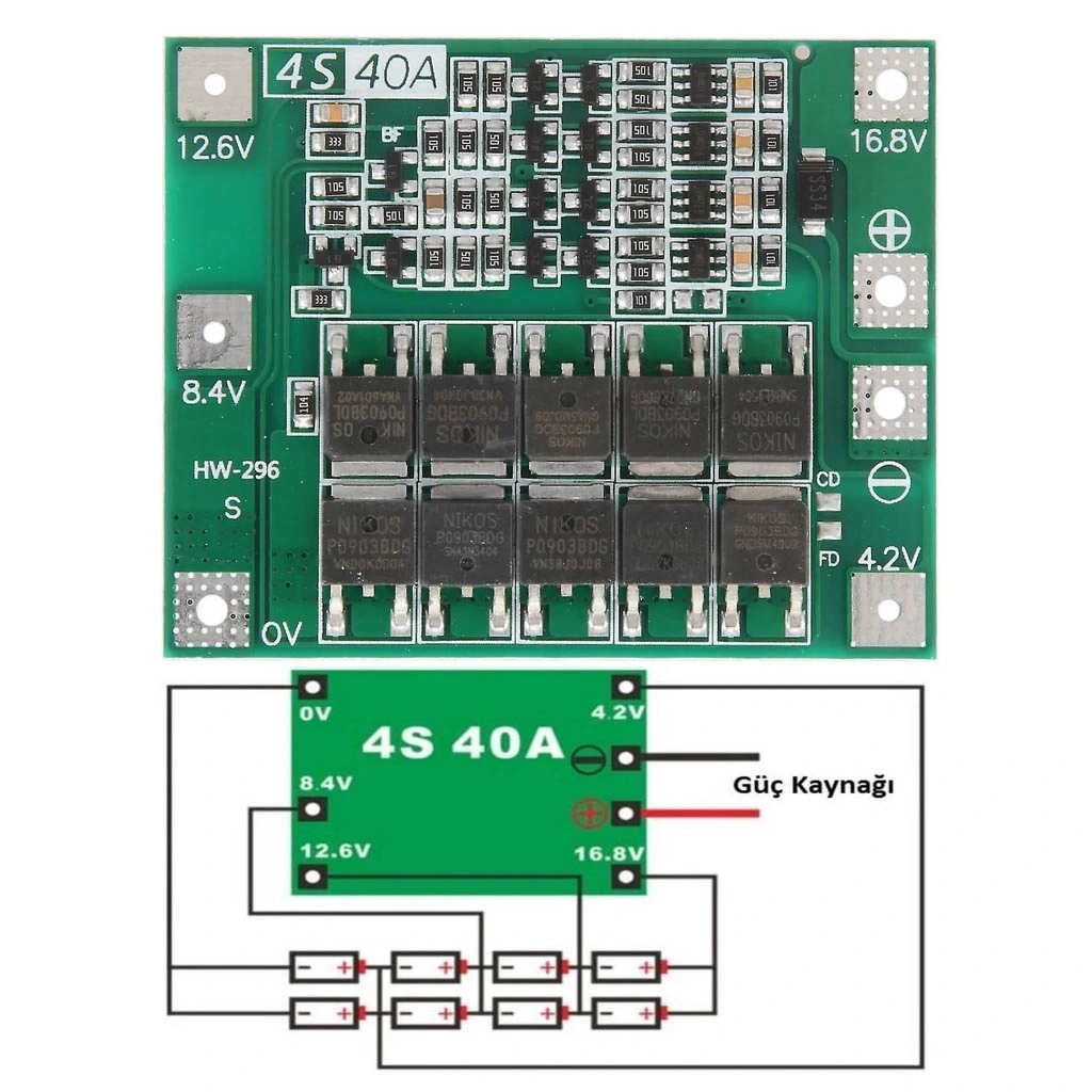 BMS 4S konfigürasyonu için tasarlanmıştır, yani 4 seri hücre (14.8V) için uygundur. Paralel gruplar ekleyerek 4S1P, 4S2P, 4S3P gibi yapılandırmalar oluşturabilirsiniz. 40A limiti aşılmadığı sürece paralel sayısını artırabilirsiniz.