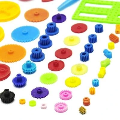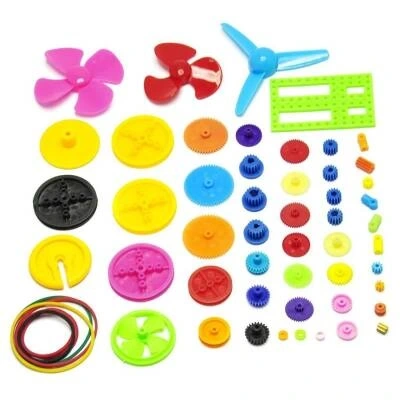 İçerisinde farklı boyutlarda pervaneler, dişliler, kasnaklar ve lastikler bulunduran plastik mekanik parça setidir.