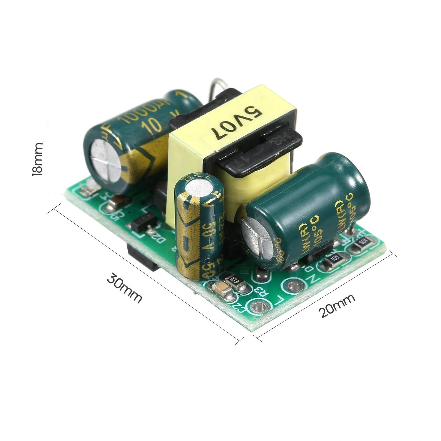 5V 700mA AC-DC Step Down Modül, AC şebeke gerilimini doğrudan 5V DC gerilime dönüştüren kompakt bir güç kaynağı çözümüdür. 100-240V AC giriş aralığında çalışarak evrensel kullanım imkanı sunar.