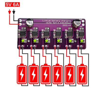6-Kanal Bağımsız 4.2V 18650 Pil Şarj Devresi, 18650 pillerinizi ve 1S lipo bataryalarınızı şarj edebileceğiniz 6 kanal bağımsız şarj devresidir. Her kanaldan 1 amper şarj akımını desteklemektedir. Bu sebeple minimum besleme 5V 6 amper olmalıdır.