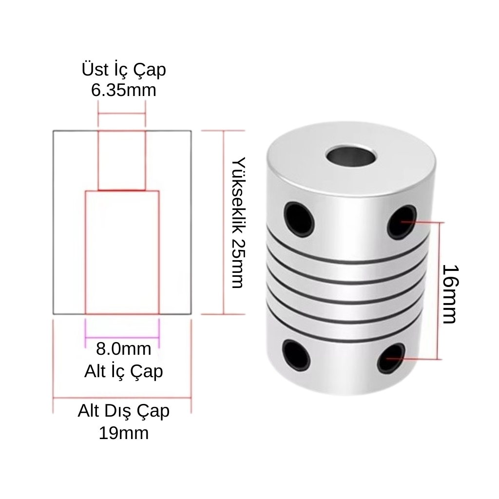 3D Yazıcı CNC Uyumlu 6.35x8mm Esnek Kaplin