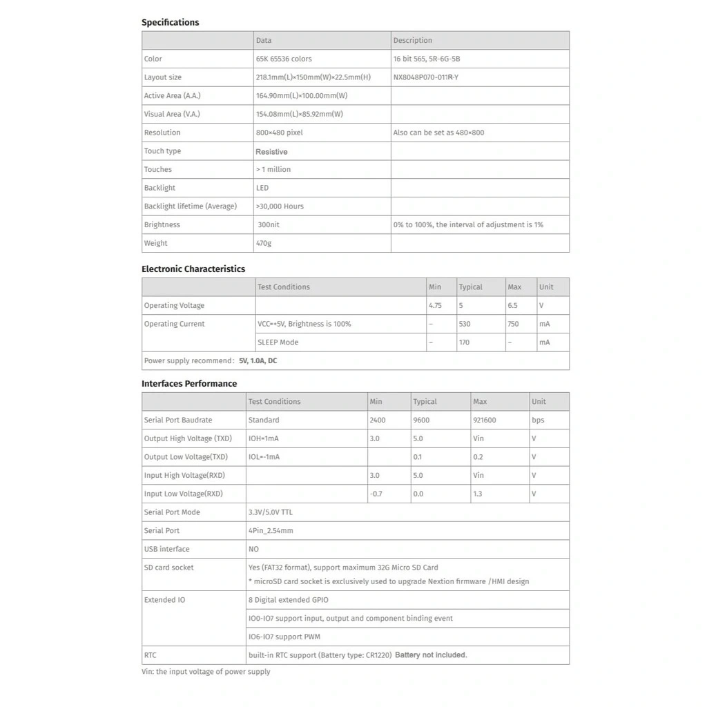 Bu bölümde 7.0 Inch Nextion R-Rezistif Ekranın detaylı teknik özellikleri listelenmektedir.