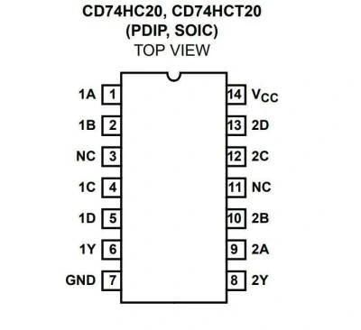 74HCT20, çift 4 girişli bir NAND geçididir. Girişler kelepçe diyotlarını içerir. Bu, girişleri VCC'nin üzerindeki Voltajlara arayüzlemek için akım sınırlama dirençlerinin kullanılmasını sağlar.
