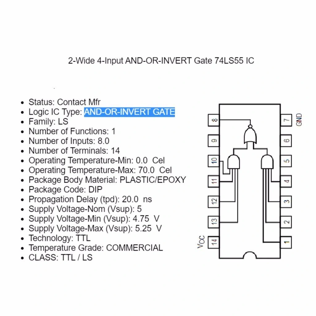 74LS55, AND-OR-INVERT fonksiyonu sunan kompleks mantık entegresidir. İki adet 2-2-2-3 girişli yapıda düzenlenmiş AOI fonksiyonu içerir, karmaşık mantık devrelerini basitleştirir.