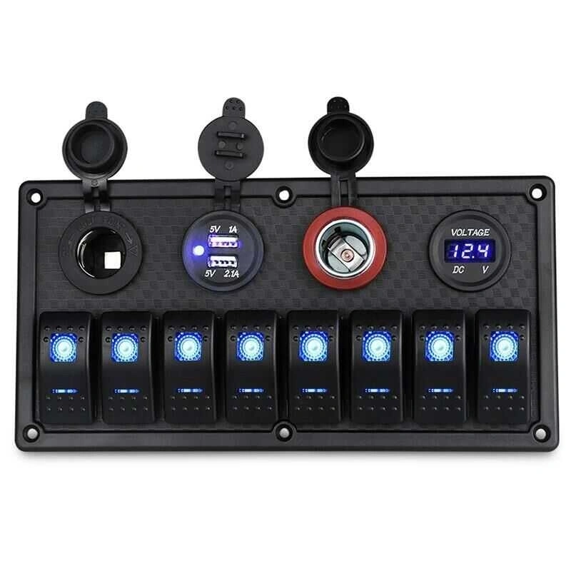 8'li ON-OFF Mavi Işıklı Anahtar Panel 2x5V USB 2xÇakmaklık ve Voltaj Göstergeli