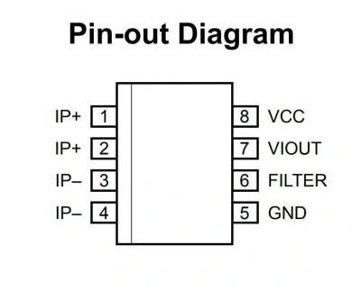 ACS714, 2.1kVRMS Voltaj izolasyonu ve düşük dirençli akım iletkeni ile Hall Etkisi tabanlı Doğrusal Akım Sensörü IC'dir. Cihaz, kalıbın yüzeyine yakın yerleştirilmiş bir bakır iletim yoluna sahip, hassas, düşük ofsetli, lineer bir hall sensör devresinden oluşur. Bu bakır iletim yolundan akan uygulanan akım, entegre hall IC tarafından algılanan ve orantılı bir Voltaja dönüştürülen bir manyetik alan üretir. Cihaz doğruluğu, manyetik sinyalin salon dönüştürücüye yakınlığı sayesinde optimize edilir. Akım algılama için kullanılan yol olan birincil bakır iletim yolundan (1 ve 2 numaralı pinlerden 3 ve 4 numaralı pinlere) artan bir akım aktığında, cihazın çıkışı pozitif bir eğime (>VIOUT(Q)) sahiptir. Bu iletken yolun dahili direnci tipik olarak 1,2 mR'dir ve düşük güç kaybı sağlar. Bakır iletkenin kalınlığı, cihazın 5 kata kadar aşırı akım koşullarında hayatta kalmasını sağlar.