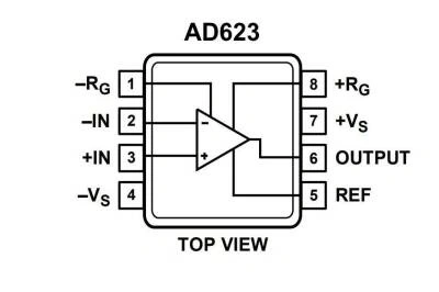 AD623, 2,7 V ila 12 V arasındaki besleme Voltajlarını kullanarak raydan raya çıkış salınımı sağlayan entegre, tek veya çift beslemeli bir enstrümantasyon amplifikatörüdür. AD623, tek kazanç seti direnç programlamasına izin vererek ve 8 uçlu endüstri standardı pin çıkışı yapılandırması. Harici direnç olmadan AD623, birlik kazancı (G = 1) için yapılandırılır ve harici bir dirençle AD623, 1000'e kadar kazanç için programlanabilir. AD623, geniş bir ortak mod giriş aralığına sahiptir ve ortak mod Voltajları yerden 150 mV kadar düşük olan sinyalleri yükseltir. AD623, çift ve tek kutuplu güç kaynaklarıyla optimum performansı korur.