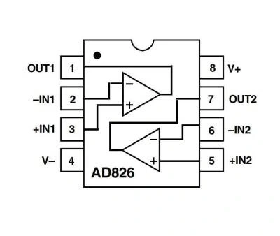 AD826, çift, yüksek hızlı bir Voltaj geri beslemeli op amp'tir. Tamponlama ve kablo sürme gibi birlik kazanç kararlılığı ve yüksek çıkışlı sürücü kapasitesi gerektiren uygulamalarda kullanım için idealdir. 50 MHz bant genişliği ve 350 V/µs dönüş hızı, AD826'yı video, CATV, fotokopi makineleri, LCD'ler, görüntü tarayıcılar ve faks makineleri dahil olmak üzere birçok yüksek hızlı uygulamada kullanışlı hale getirir.