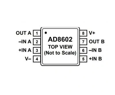 AD8602, çok düşük ofset Voltajı ve geniş sinyal bant genişliğine sahip tekli, ikili ve dörtlü raydan raya, giriş ve çıkış, tek beslemeli amplifikatörlerdir. Bu amplifikatörler, lazer kırpma olmadan üstün performans sağlayan yeni, patentli bir kırpma tekniği kullanır. Tümü, 3 V ila 5 V tekli beslemede çalışmak üzere tam olarak belirtilmiştir.