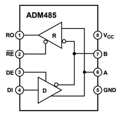 ADM485, çok noktalı veri yolu iletim hatlarında yüksek hızlı çift yönlü veri iletişimi için uygun bir diferansiyel hat alıcı-vericisidir. Dengeli veri iletimi için tasarlanmıştır ve EIA standartları RS-485 ve RS-422 ile uyumludur. Parça, bir diferansiyel hat sürücüsü ve bir diferansiyel hat alıcısı içerir. Hem sürücü hem de alıcı bağımsız olarak etkinleştirilebilir. Devre dışı bırakıldığında, çıkışlar üç durumludur.