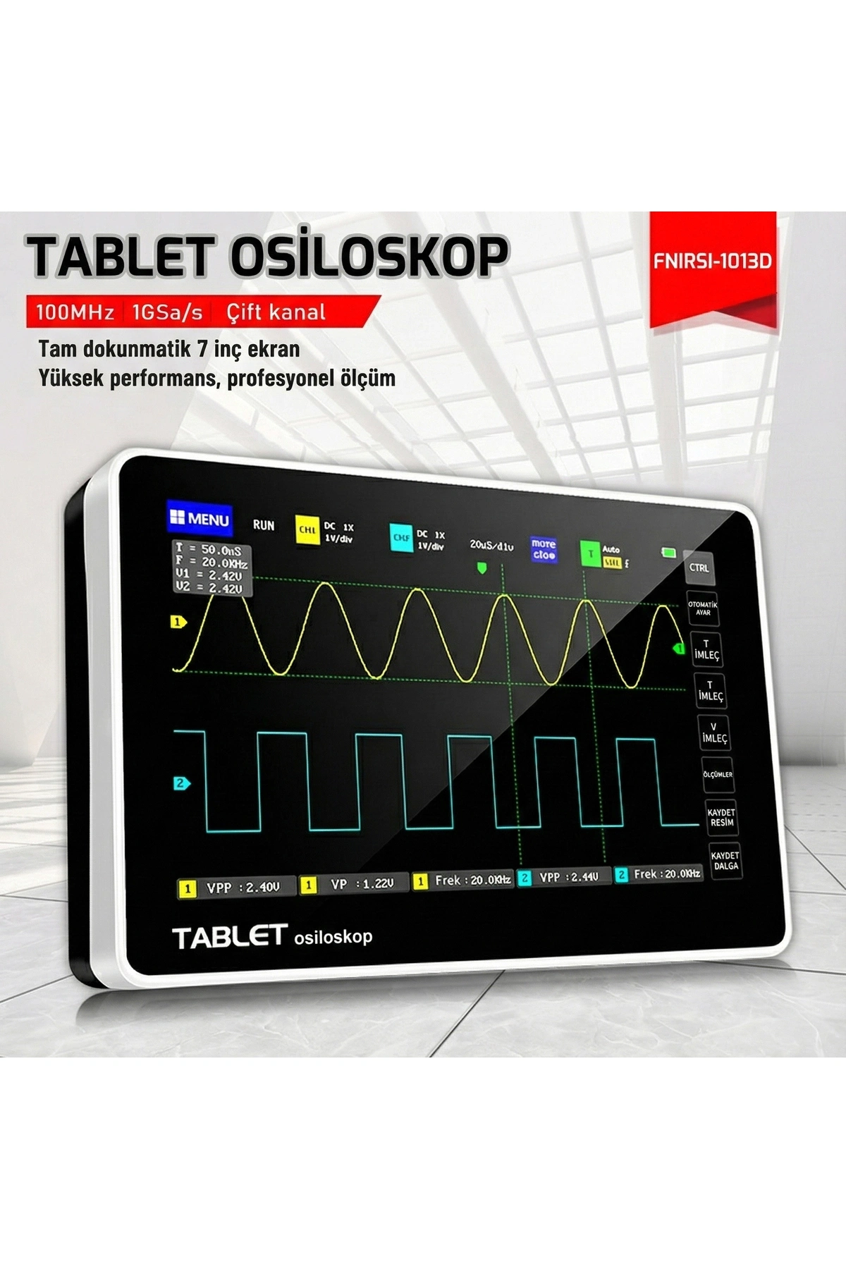 FNIRSI ADS1013D 2 Kanal 100MHz 1GSa/s Dijital Dokunmatik Tablet Osiloskop, 100MHz analog bant genişliği ve 1GSa/s örnekleme oranı ile gerçek zamanlı ölçümler yapmanızı sağlar. Bu osiloskop, 7 inçlik bir dokunmatik ekrana sahiptir ve 12 farklı parametreyi ölçebilir. Ayrıca, tek tuşla dalga formu depolama ve ekran görüntüsü alma özellikleri de mevcuttur. Ürünün boyutları 184 x 124 x 50mm?dir ve 986g ağırlığındadır