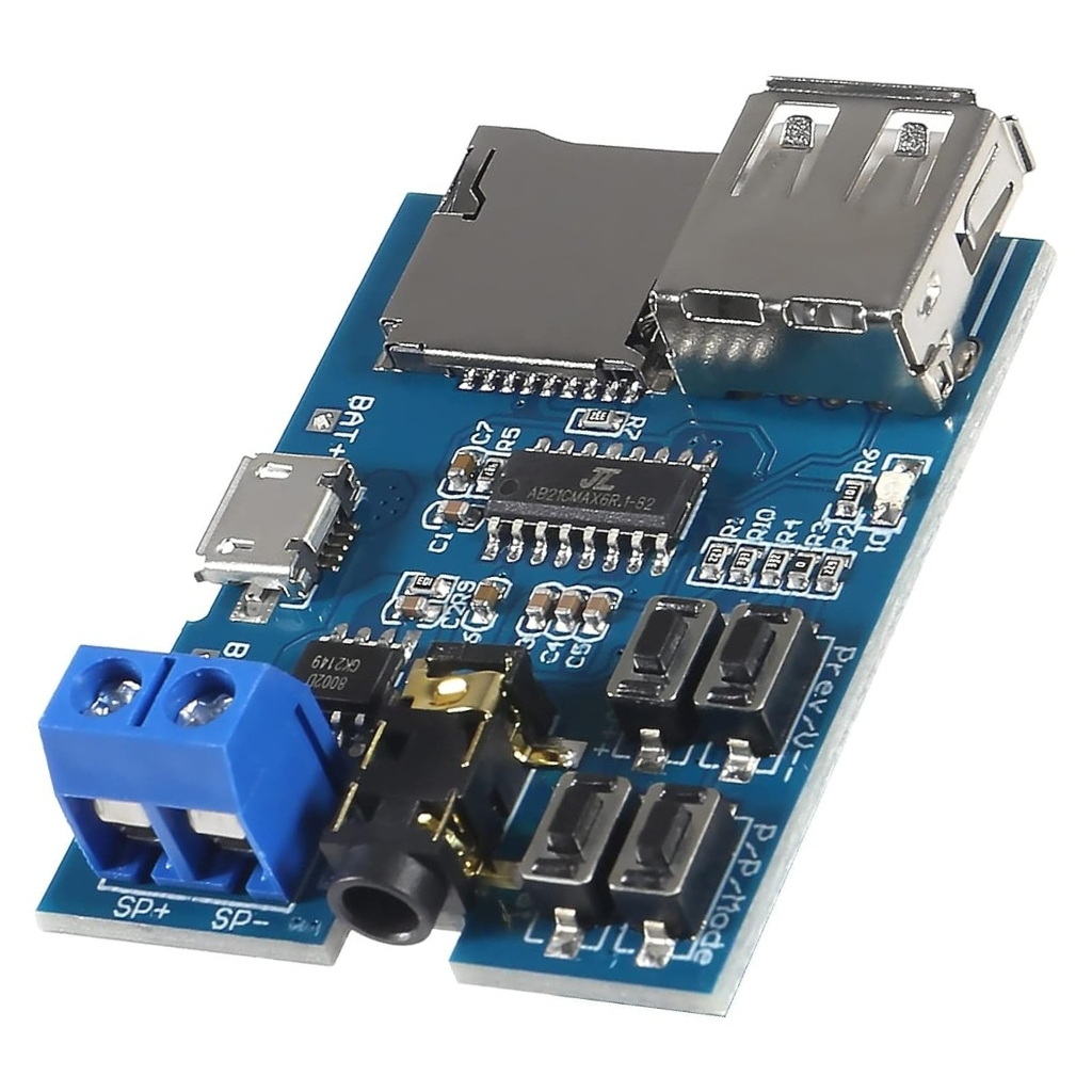 Mono 3W Amplifikatör ve MP3 Çalar Devresi, düşük güçlü ses uygulamaları için ideal bir ses yükseltici ve oynatıcı modüldür. USB veya microSD kart üzerinden MP3 dosyalarını çalabilir ve 3 watt çıkış gücüyle küçük hoparlörleri sürerek net ses performansı sunar. Kompakt ve enerji tasarruflu yapısı sayesinde taşınabilir ses projelerinde ve küçük elektronik cihazlarda kolayca kullanılabilir.