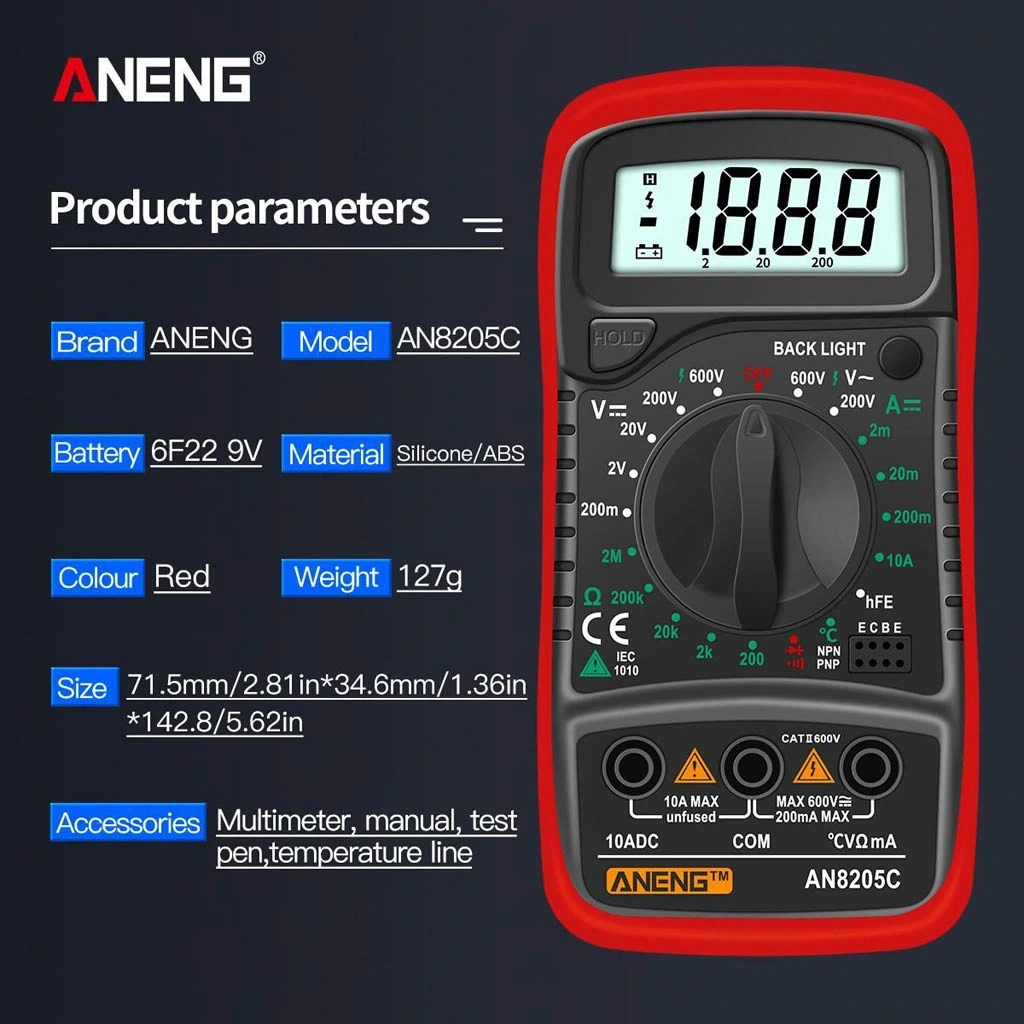 Ekonomik fiyatı ve güvenilir ölçüm performansıyla, temel elektronik ve elektrik işleriyle uğraşan herkes için uygun bir seçenek olan ANENG AN8205C, Kırmızı renkli tasarımıyla çalışma alanınızda da kolayca bulunabilir.