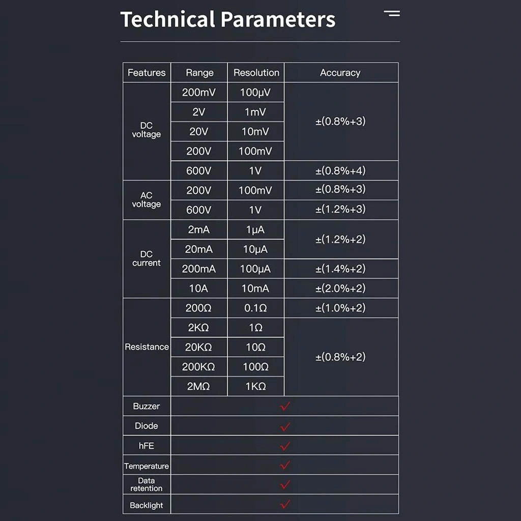 DC voltaj için ±0.5%, AC voltaj için ±1.2%, DC akım için ±1.0%, direnç için ±0.8% doğruluk sunar. Temel ölçümler için yeterlidir.