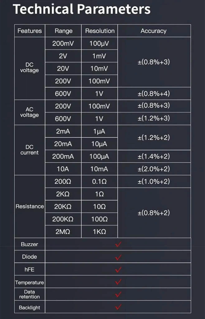 DC voltaj için ±0.5%, AC voltaj için ±1.2%, DC akım için ±1.0%, direnç için ±0.8% doğruluk sunar. Temel ölçümler için yeterlidir.