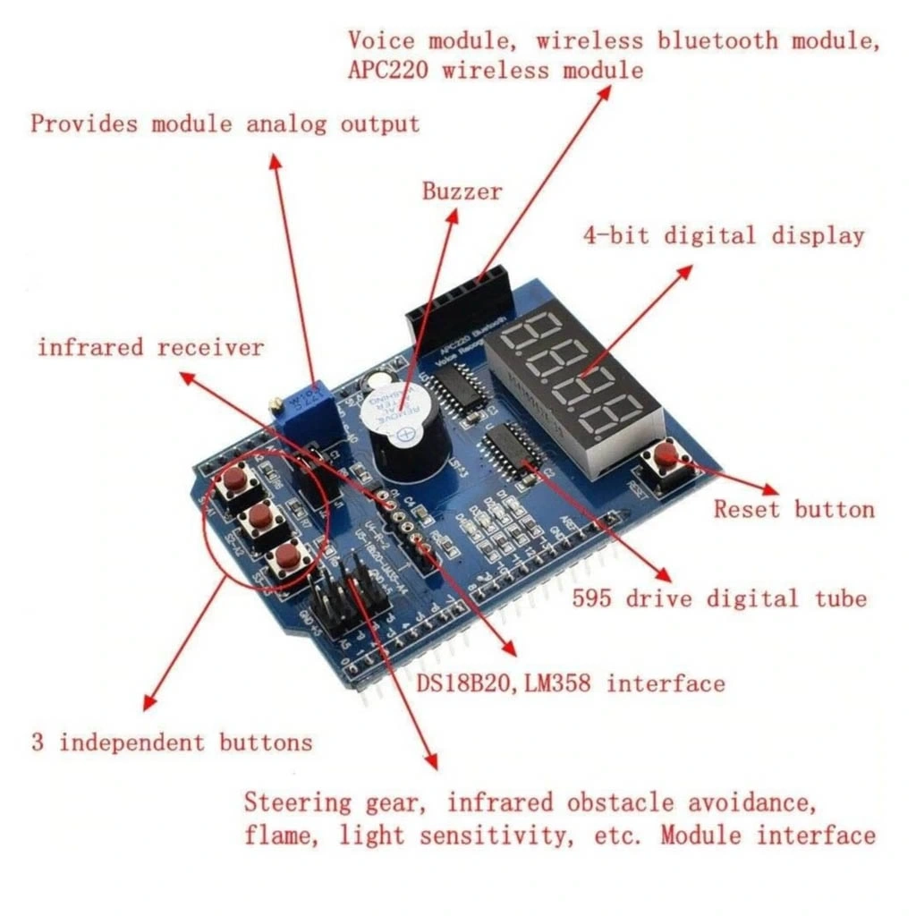 Arduino Çok Fonksiyonlu Genişletme Kartı, Arduino UNO ve uyumlu geliştirme kartları için kapsamlı bir genişletme çözümüdür. Tek bir modülde birden fazla fonksiyon sunan bu genişletme kartı, Arduino projelerinize hızlıca çeşitli sensör, motor ve iletişim modülleri eklemenizi sağlar.