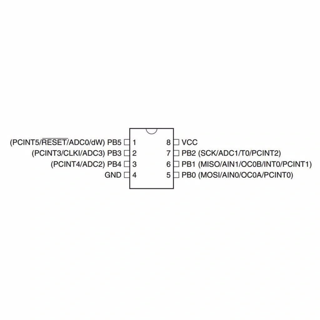 - PB5 (Pin 1): I/O, PCINT5, RESET, ADC0, dW