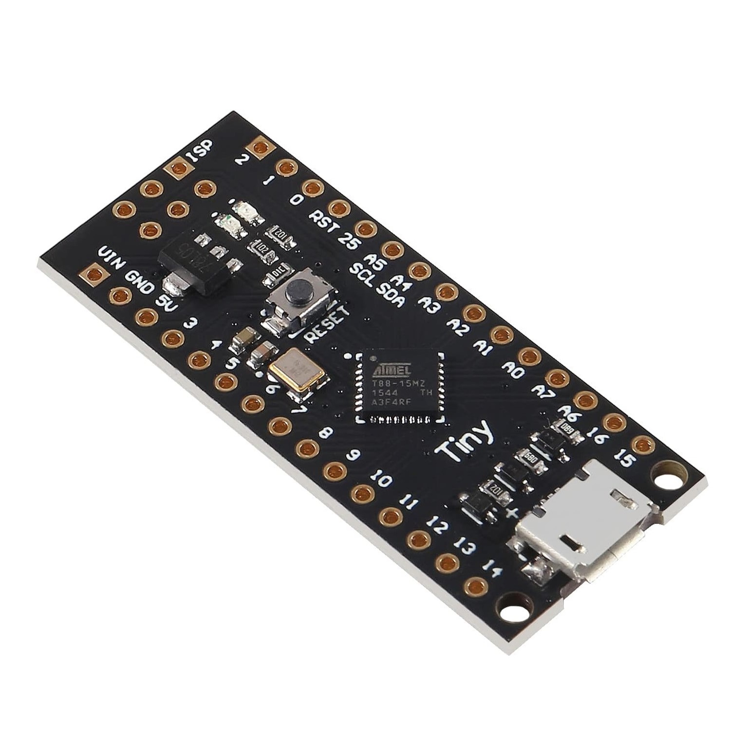 ATTINY88 Geliştirme Kartı, Atmel ATTINY88 mikrodenetleyiciye dayalı kompakt bir geliştirme kartıdır. Küçük projelerde kullanılmak üzere tasarlanmış, düşük güç tüketimi ve basit kullanım imkânı sağlar. Arduino IDE ile uyumludur ve çeşitli sensörler, motorlar ve diğer elektronik bileşenlerle kullanılabilir.