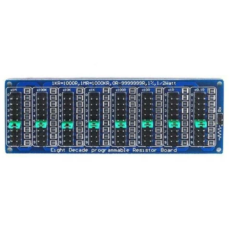 Ayarlı Direnç Modülü 1/2W 0.1R-10M Ayarlı Direnç Modülü 1/2W 0.1R-10M. Modül sayesinde 0.1 ~ 9999999R arasında direnç değeri alabilirsiniz. Ürün üzerinde x1M, x100K, x10K, x1K, x100R, x10R, x1R, x0.1R şeklinde 8 adet kanal bulunmaktadır. Direnç ayarı için her kanalda 0,1,2,3... şeklinde değerler bulunmaktadır. Ayarlanmak istenen değere kısa devre jumperini yerleştirip istediğiniz direnç değerini elde edebilirsiniz. Çıkış direncini RX pinlerinden alabilirsiniz. Maksimum 200 volta dayanıklıdır. Teknik Özellikler Çalışma Voltajı: Max. 200V Anma Gücü: 1/2W Direnç Toleransı: %1 Direnç Aralığı: 0.1 ~ 9999999R Boyut: 103x35x10mm.