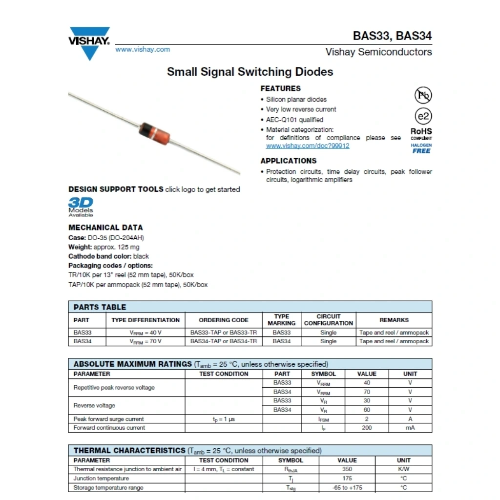 BAS34, düşük ileri voltaj düşümü ve yüksek anahtarlama hızıyla öne çıkan, yüzey montajlı (SMD) bir Schottky diyottur. Hassas ve yüksek hızlı elektronik devrelerde ters akım koruması, voltaj kırpma (clamping), sinyal düzeltme ve yönlendirme gibi görevlerde kullanılır.