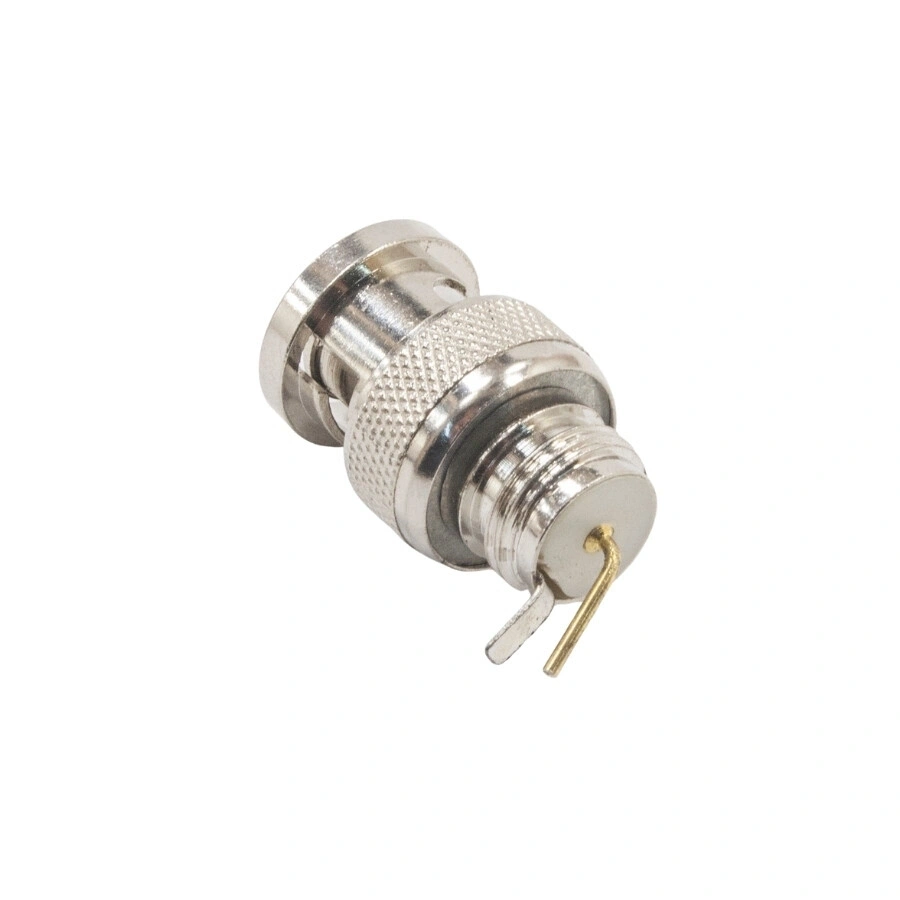 BNC Erkek Şase Konnektör BNC konektörü, koaksiyel kablo için kullanılan minyatür bir hızlı bağlantı/bağlantı kesme radyo frekansı konektörüdür. BNC konektörü, 50 ohm'luk bir ön montaj bölmeli soket konektörüdür. Çeşitli dijital TV, kablo TV, bağlantı izleme ekipmanı, mobil ekipman, çeşitli enstrüman türlerinin ve diğer yönlerin iletişim ekipmanı test ekipmanlarında yaygın olarak kullanılmaktadır. Pini 90 derecedir. Çapı 13.5mm toplam uzunluğu 21.3mm'dir..