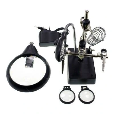Değiştirilebilir büyütme merceği ve aydınlatmalı led ışıkları olan kullanışlı havya standı Lehimleme ve modelleme alanında faydalı yardımcı alet. Değiştirilebilir büyütme ile, iki yardımcı lens uzayabilir ve açıyla ayarlanabilir, böylece işlem daha rahat olur. 3 çeşit büyütme merceği: 2.5X 90mm (çap), 7.5X 34mm, 10X 34mm. Esnek metal tüp üzerine 5 adet LED'li bağımsız parlak bir aydınlatma lambası takılmıştır. Işıkların mesafesi ve açısı serbestçe ayarlanabilir. Masa lambası olarak kullanılabilir. Destek kelepçeleri ve timsah klipsleri ayarlanabilir. Üçüncü el gerektiğinde ideal bir araçtır. Taban ağırlığı arttırmak ve dengeyi güçlendirmek için taban yüzeyi çelik sac ile dolgulanır. 3 * AA pillerin harici güç adaptörüyle beslenir (dahil değildir). Uygulama alanı: elektronik kaynak, modelleme, pul toplama, nakış, antikalar, biyolojik gözlem, okuma vb. Paket içeriği: 1 * Temel Stand & LED Işık 1 * 90mm Çaplı Mercek 2 * 34mm Çaplı Lens 1 * EU Güç Adaptörü 1 * Kullanım Kılavuzu.