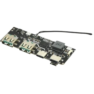 Çift USB 5V 22.5W Led\\\'li Micro Type-C Powerbank Modülü, 5 portlu ve hızlı şarj destekli bu güç kaynağı modülü, DIY powerbank için mükemmeldir. Kısa devre koruması, aşırı şarj koruması ve aşırı deşarj koruması vardır. PD/QC/AFC hızlı şarj protokollerini desteklemektedir. Çift USB çıkışa sahiptir. Üzerinde NTC termistör bulunmaktadır. Bu sayede sıcaklık durumuna göre devre kendini korumaya almaktadır. Şarj durumundayken LED güç göstergesi için bir düğme vardır.