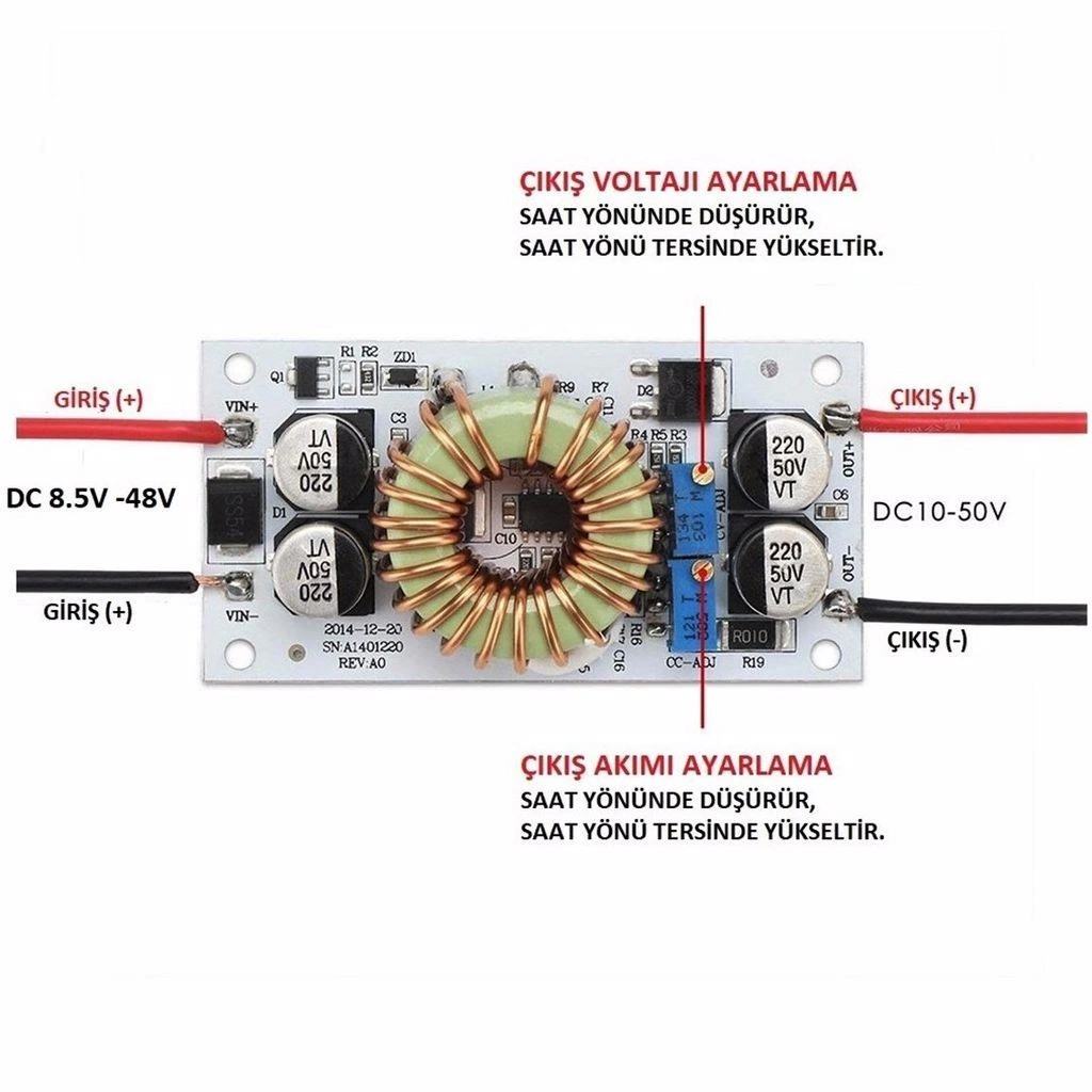 Giriş voltajı 10-60V, çıkış voltajı 12V-80V arasında ayarlanabilir. Çıkış voltajı her zaman giriş voltajından yüksek olmalıdır.