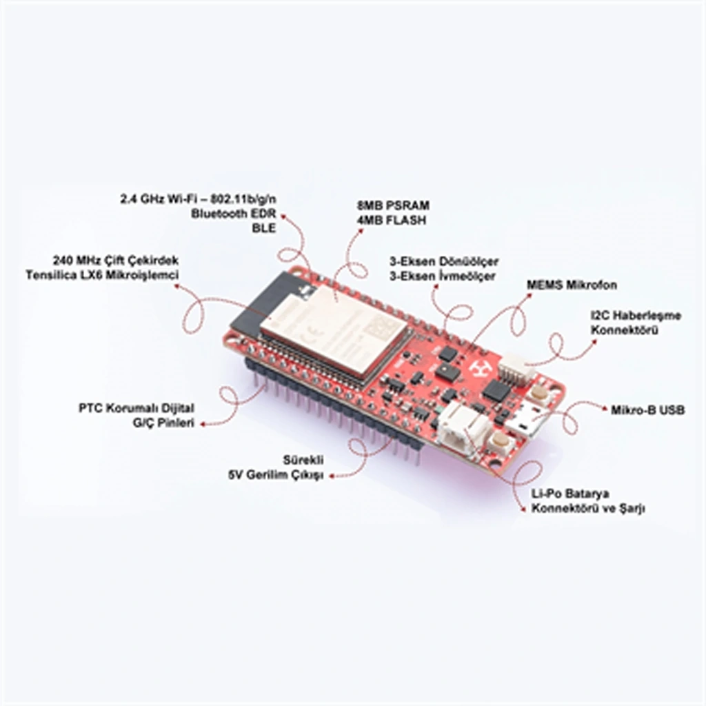 Güçlü çift çekirdek Tensilica Xtensa LX6 mikroişlemcisi ile makine öğrenmesi ve yapay zeka tabanlı projelere Tensorflow Lite ile başlayabilirsiniz.
