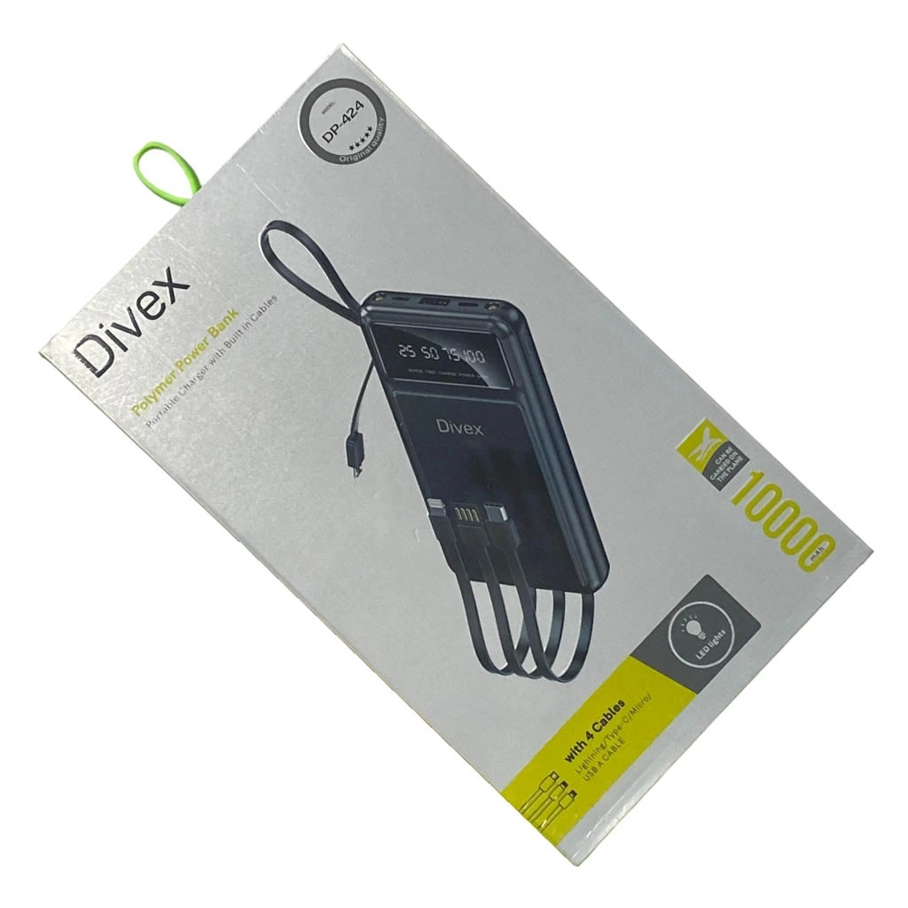 Divex 10000 mAh PowerBank, 4 farklı dahili kablosu ile ekstra şarj kablosu taşıma ihtiyacını ortadan kaldıran pratik bir mobil şarj çözümüdür. Tek bir cihazla tüm akıllı cihazlarınızı şarj etme imkanı sunar.