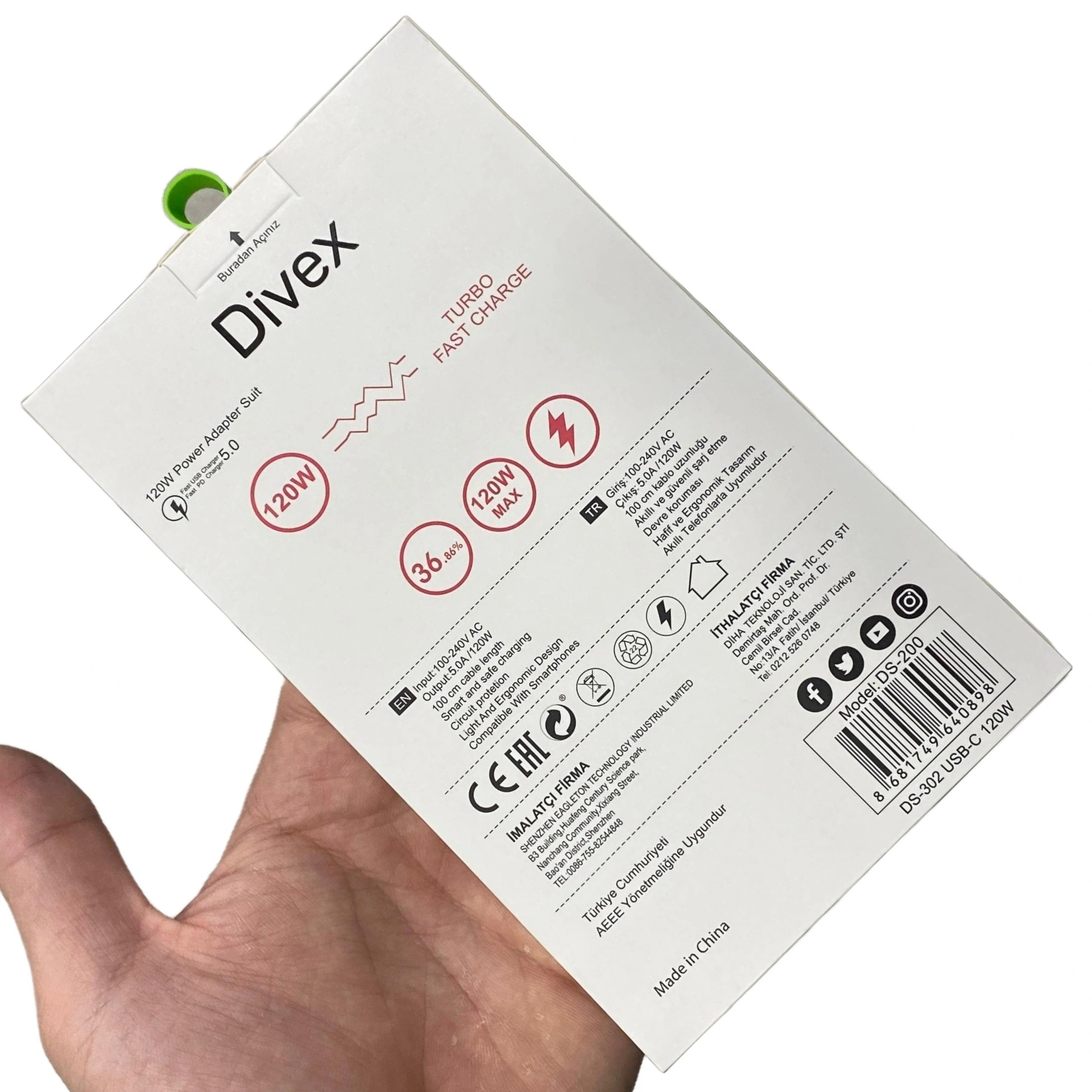 DIVEX 120W 3A USB Type-C Yüksek Hızlı Şarj Aleti'nin teknik entegrasyon bilgileri.