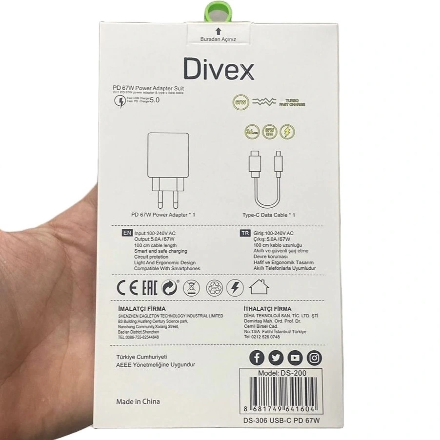DIVEX 67W Type-C USB-C USB Yüksek Hızlı Şarj Aleti'nin detaylı teknik özellikleri aşağıda listelenmiştir.