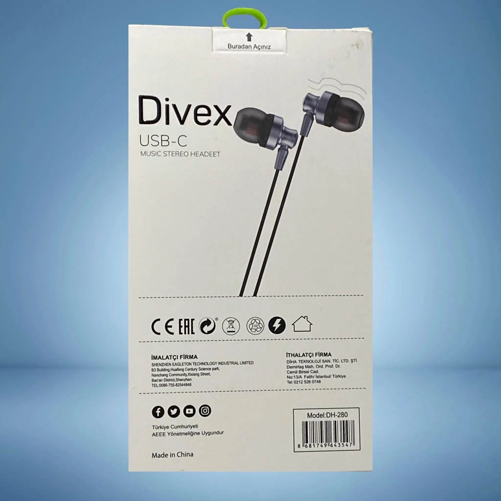 Divex Type-C USB-C Stereo Kulaklık, Type-C bağlantı portuna sahip modern akıllı telefonlar için tasarlanmış kulak içi kulaklıktır. Kablo üzerindeki kumanda ile müzik kontrolü ve aramaları yönetme imkanı sunar.